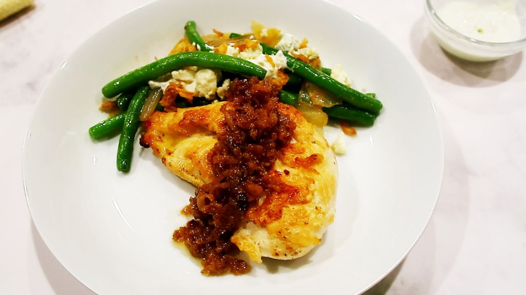 Today, we are savoring an exquisite dish known as Chicken with Fig and Bacon Jam. This culinary creation is celebrated in numerous restaurants and home kitchens alike, showcasing its widespread appeal. The delightful pairing of tender, juicy chicken with vibrant, crisp green beans creates a wonderful medley of textures and flavors; the chicken is perfectly cooked to maintain its succulence, while the green beans offer a satisfying, tender crunch.