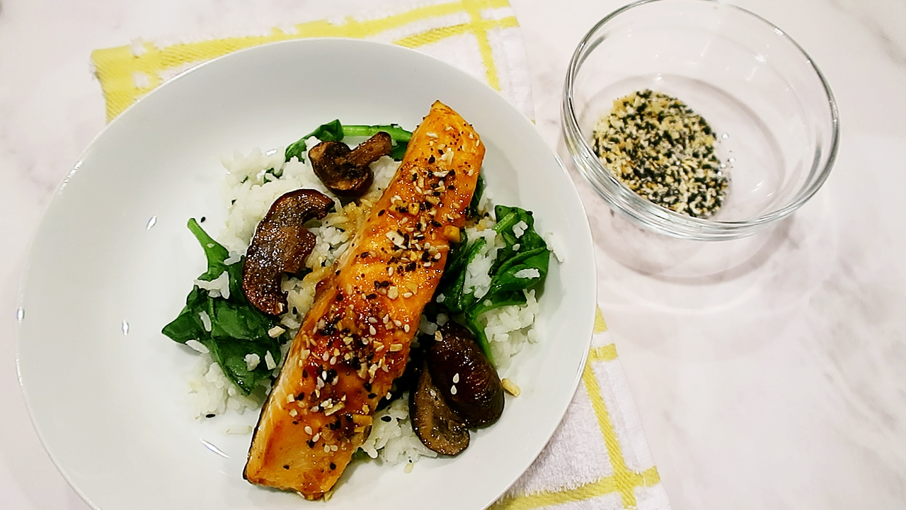 Fluff rice and spinach and combine. Separate salmon from the skin, if desired. Serve rice topped with salmon and mushrooms. Drizzle with miso vinaigrette and garnish with mixed sesame seeds.