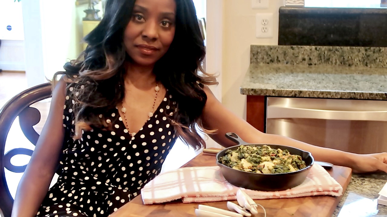 6. Add green onions, tomatoes, coriander, cumin, turmeric, thyme, and pepper. Stir for 2 minutes.